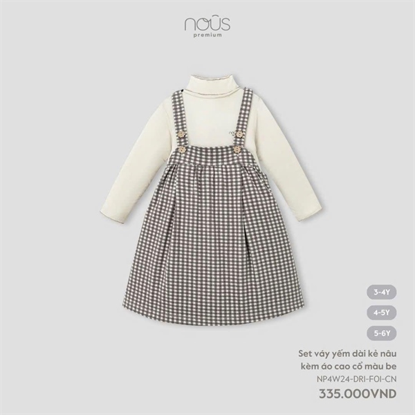 Nous Set váy yếm kẻ nâu kèm áo cao cổ màu be