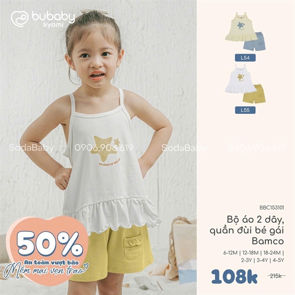 Bu Bộ áo 2 dây, quần đùi bé gái Bamco - Kem - Xanh ghi