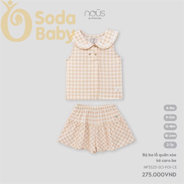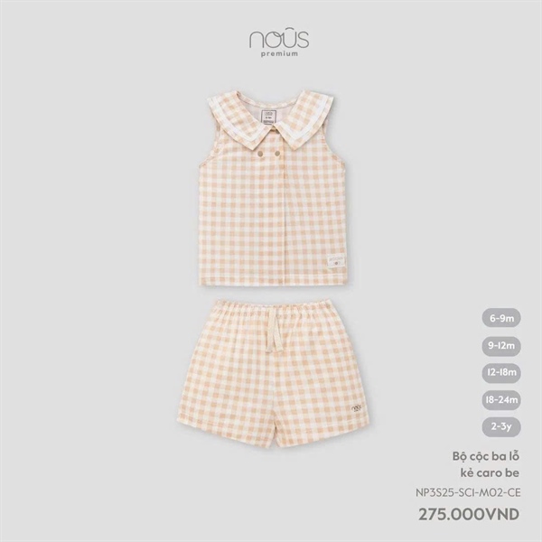 Nous Bộ 3 lỗ quần xòe kẻ caro - be