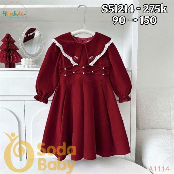 Váy nhung dài tay đỏ cổ ren (90-150)